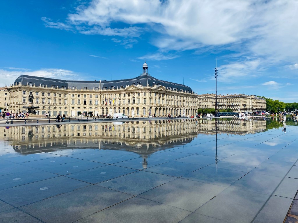 Justo enfrente de esta se encuentra El espejo del agua o Le Miroir d’Eau fue diseñado por el paisajista Michel Corajoud con una serie de chorros de agua que salen del suelo. La magia de este lugar radica en el hecho de que la Plaza de la Bolsa se refleja perfectamente en el suelo. Sin duda, esta es la fotografía más repetida en la ciudad.
