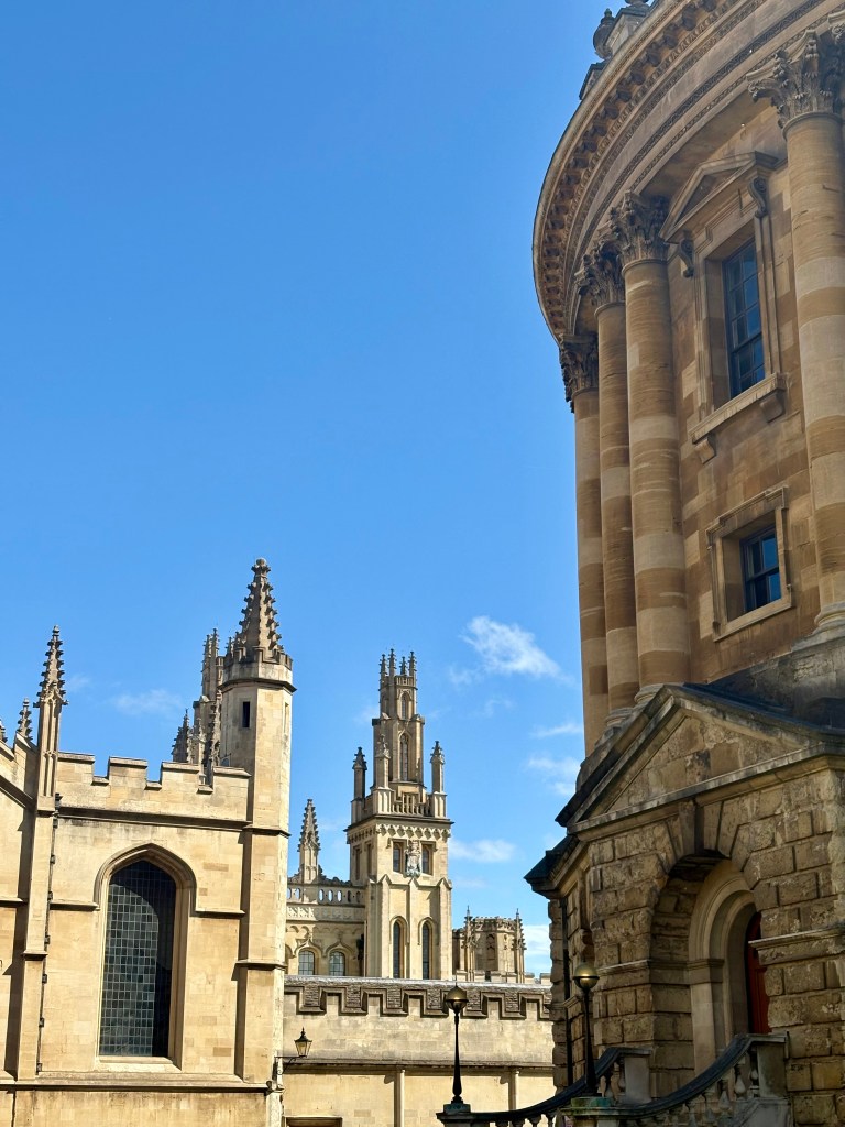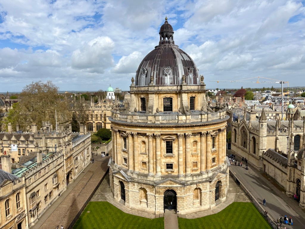 El paisaje urbano de Oxford se caracteriza por su arquitectura gótica y neoclásica, que ha permanecido notablemente bien conservada. Sus calles estrechas, patios interiores y edificios de piedra crean una atmósfera que parece detenida en el tiempo. Uno de los elementos más icónicos es la Radcliffe Camera, una estructura circular que forma parte de la red de bibliotecas universitarias y que se ha convertido en uno de los símbolos visuales más reconocibles de la ciudad. Junto con las torres y cúpulas de los colleges, configura un skyline único en el Reino Unido.